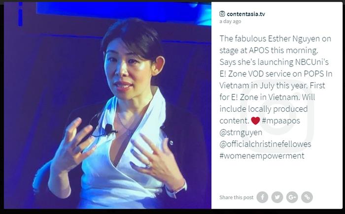Trong phần tham gia thảo luận của mình tại APOS 2018, bà Esther Nguyễn đã trình bày về việc sẽ phát hành chính thức trang thông tin điện tử E!Zone đầu tiên tại thị trường Việt Nam thông qua sự hợp tác giữa POPS Worldwide và NCBUniversal vào tháng 7 tới đây.