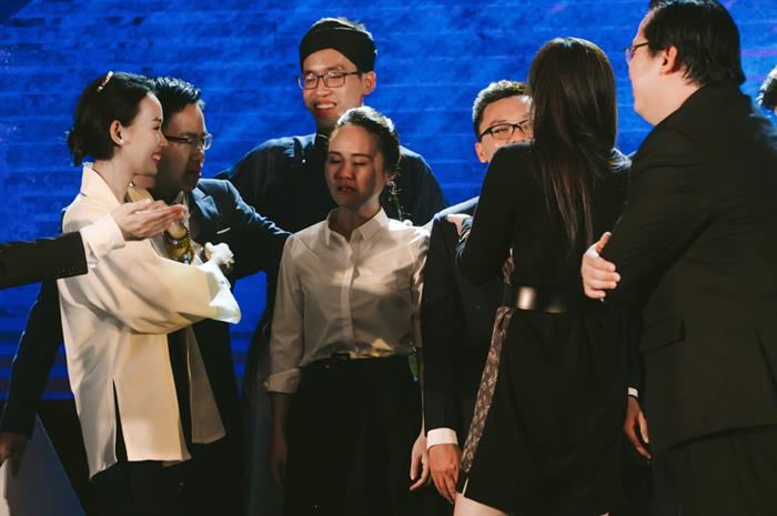 Hoàng Thảo khóc trong vòng người. Phải chăng là các thí sinh và BGK đang chúc mừng cô?