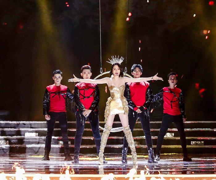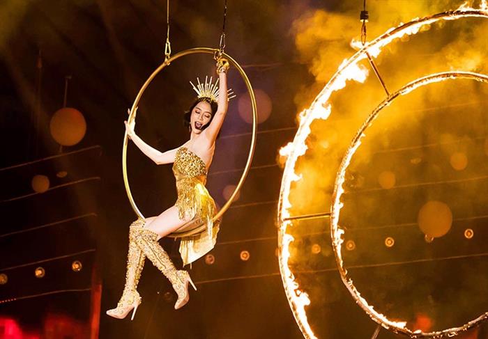 Tintuc - Thiều Bảo Trang đã thực sự có một tiết mục xuất sắc không kém phần mạo hiểm đu vòng lửa không cần tới dây an toàn và độ nguy hiểm rất cao nhưng cô vẫn hết mình cống hiến và đem tới một phần trình diễn quá mãn nhãn người xem.