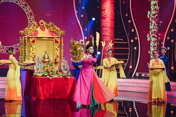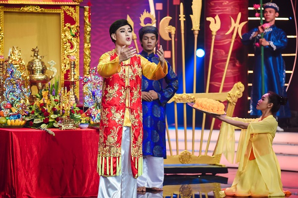 Nam diễn viên biểu diễn các hình thức diễn xướng cúng bà gồm các nghi thức: hát mời chào, các điệu múa dâng mâm vàng và trình diễn kỹ năng tạp kỹ tung hứng… Anh chàng giữ thăng bằng mâm vàng, nhánh huệ, lông công… múa theo nhịp trống, di chuyển khéo léo khiến tất cả giám khảo, khán giả nhiều phen “thót tim”.