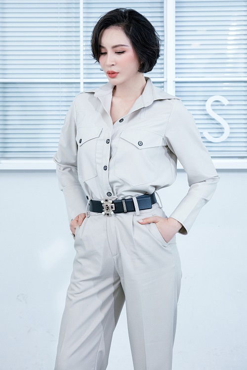 Bộ trang phục gam màu ghi tôn lên vẻ sành điệu cho MC Thanh Mai. Cô cũng trông trẻ trung hơn nhờ mái tóc xoăn lọn.