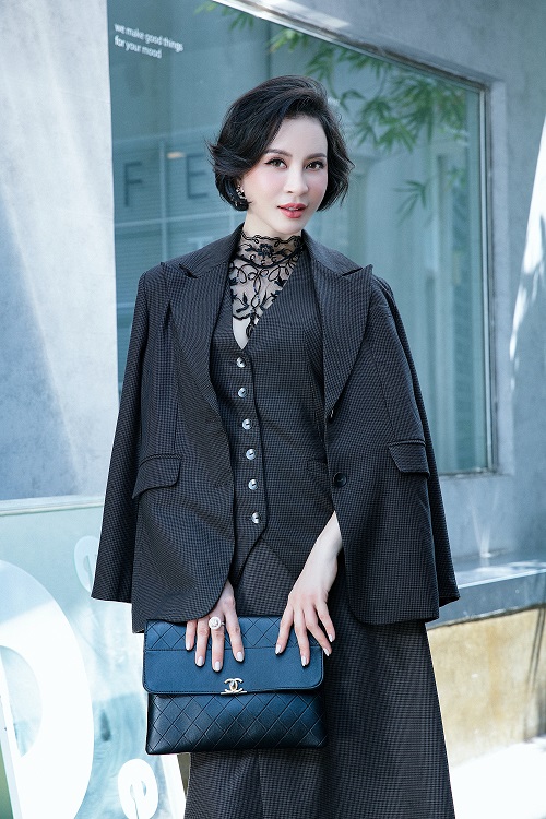 Để tránh hở hang quá mức, nữ diễn viên Tình khúc Bạch Dương phối áo khoác dáng dài ton-sur-ton, cùng túi đeo Fendi tạo điểm nhấn.
