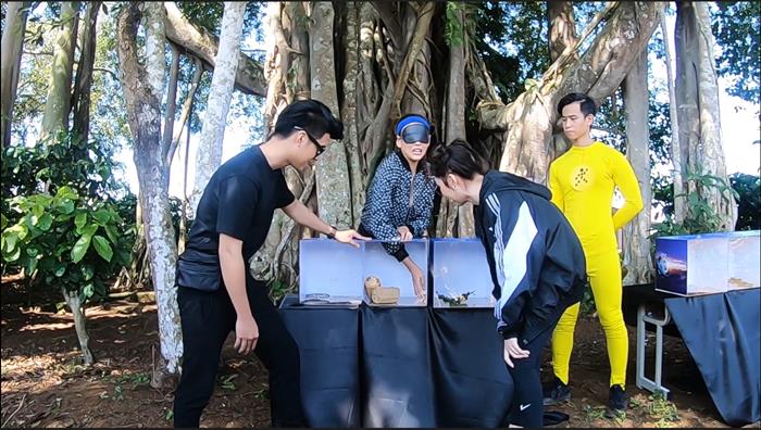 Cả hai đội đều cử hai “nàng thơ” sẽ là người phải đưa tay vào hộp trong tình trạng bị bịt mắt. Hoà Minzy là người thực hiện trước, tuy đã được trấn an nhưng cô nàng cũng không khỏi lo sợ trước khi thực hiện nhiệm vụ. Một loạt biểu cảm sợ hãi, xen lẫn những tiếng hét thất thanh của Hoà Minzy khiến mọi người bật cười thích thú. Hoà Minzy còn chứng tỏ được độ lầy của mình khi liên tục gọi hồn “Jun Phạm, Jun Đăng Dũng, Jun Vũ” trong cuộc đối đáp cùng Võ Hoàng Yến. Cuối cùng với thời gian hơn 6 phút đội Hoà Minzy và nhiếp ảnh gia Nguyễn Thành cũng đoán đúng được 3 chiếc hộp lần lượt chứa: con lươn, hạt tiêu và trái bơ.