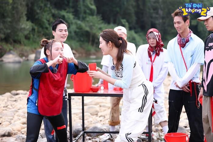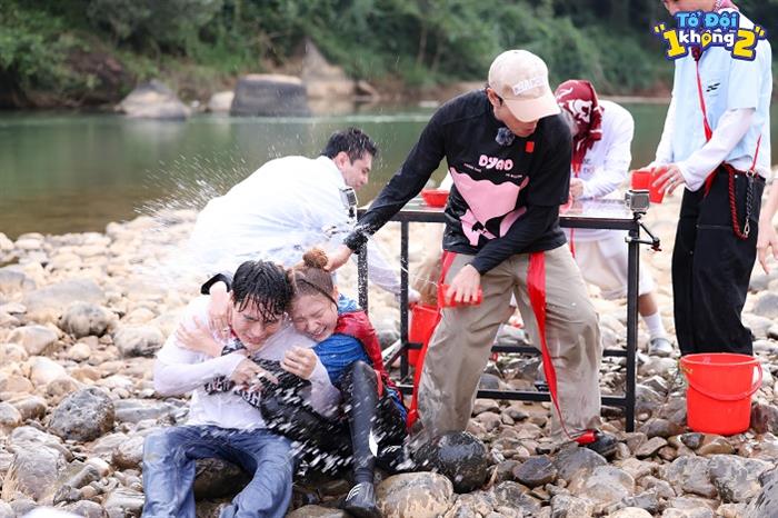 Thế là với sự “thua toàn tập” ở lần cá cược này, Võ Tấn Phát – Uyển Ân một lần nữa chịu hình phạt còn “dữ dội” hơn lần trước. Thúy Ngân không nỡ ra tay với “bé út” Uyển Ân nên nhấp nháy nhẹ vài đường phun nước. Còn đến lượt Kiều Minh Tuấn, nam diễn viên khiến Võ Tấn Phát “xanh mặt” vì màn phun nước chấn động. Uyển Ân đến bảo vệ đồng đội, vô tình liền bị “hội đồng” liên tục mấy xô nước. Chính vì thế mà có thể nói đội Võ Tấn Phát – Uyển Ân cũng “te tua” ở thử thách này không thua gì RHYDER
