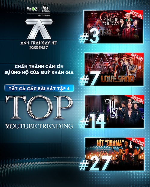 Tintuc - Anh Trai Say Hi khẳng định độ “hot” của những bản nhạc bắt tai, trendy khi cả 4 tập phát sóng đều thống lĩnh Top YouTube Trending và 100% sáng tác mới trong 4 tập đều ghi danh với thứ hạng cao trên Top YouTube Trending Music.