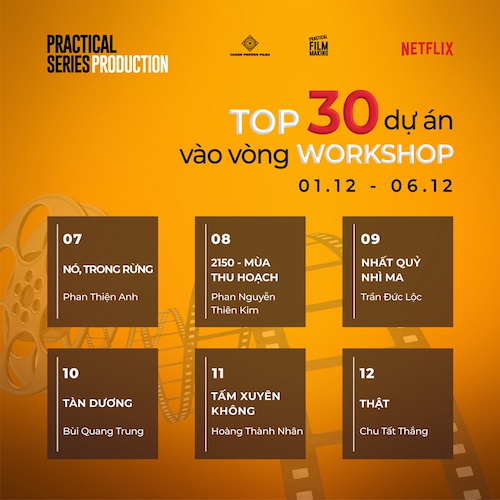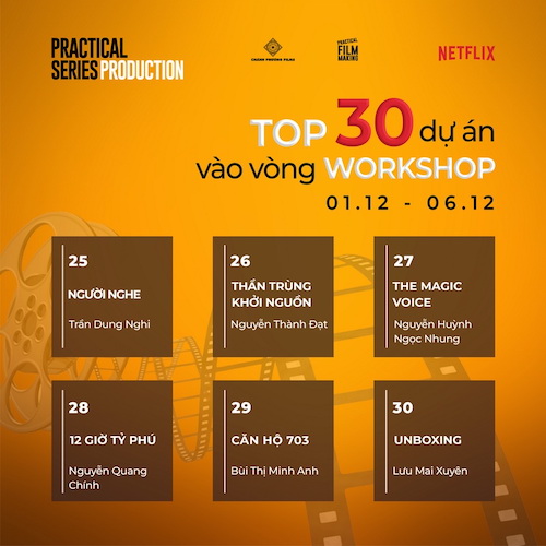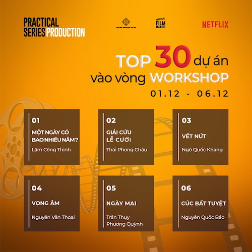 Tintuc - "Practical Series Production”, chương trình “đào tạo và hỗ trợ làm phim miễn phí” do Chánh Phương Films và Practical Filmmaking phối hợp thực hiện, quỹ Netflix Fund for Creative Equity tài trợ, vừa công bố top 30 dự án có ý tưởng thú vị nhất cũng như dàn khách mời lẫn giám khảo góp mặt ở vòng tiếp theo.