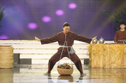 Tuấn Joker và bạn trợ diễn là diễn viên xiếc Hoàng Long Tú đã khuấy động sân khấu nhờ màn xiếc thăng bằng và tung hứng trên xe đạp 1 bánh.
