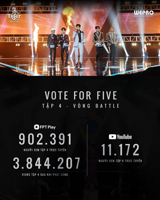Tập 4 – vòng Battle, Vote For Five ghi nhận 902.391 lượt xem cùng lúc, 3.844.207 tổng view phát sóng trên ứng dụng FPT Play, cùng 10.500 lượt xem trực tiếp trên kênh YouTube. 3 tập đầu tiên của Vote For Five cũng liên tục đạt được những con số ấn tượng, phần âm nhạc và các tình tiết của show “tạo trend” mạnh mẽ trên nền tảng TikTok.