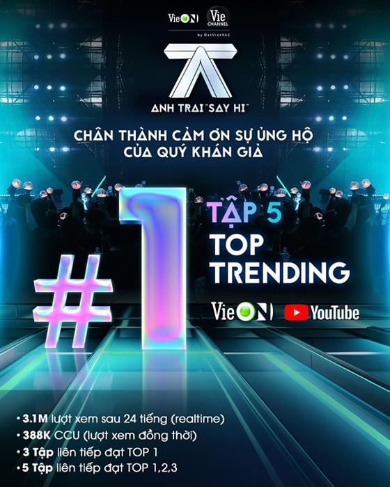 Đặc biệt, Tập 5 Anh Trai “Say Hi” cũng đánh dấu cột mốc 5 tập phát sóng liên tiếp đạt Top Trending YouTube với thứ hạng từ top 3 trở lên. Trải qua hơn 1 tháng phát sóng, chương trình Anh Trau “Say Hi” liên tục sở hữu lượt xem hàng đầu và ghi dấu trong lòng khán giả với những sáng tác mới được trình diễn trên sân khấu hoành tráng, dàn dựng chỉn chu.