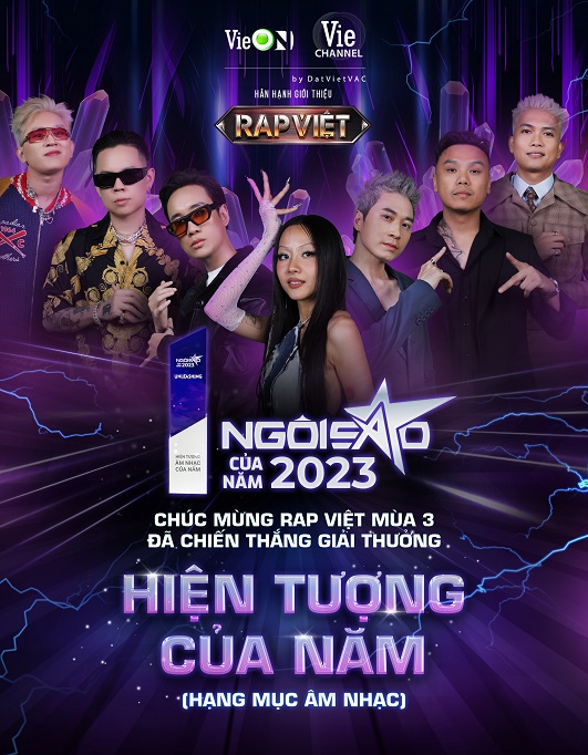 Tại đêm trao giải “Ngôi Sao Của Năm 2023” vừa diễn ra, Rap Việt Mùa 3 do Vie Channel thuộc DatVietVAC đầu tư & sản xuất đã xuất sắc giành giải thưởng Hiện Tượng Của Năm – Hạng mục Âm nhạc. Đây là giải thưởng được đánh giá và bình chọn 100% từ Hội đồng chuyên môn, dành cho các chương trình/sản phẩm nghệ thuật trong từng lĩnh vực Âm nhạc, Phim ảnh, Thời trang tạo được độ phủ sóng trên truyền thông và các nền tảng mạng xã hội, nội dung hấp dẫn và được tìm kiếm nhiều.