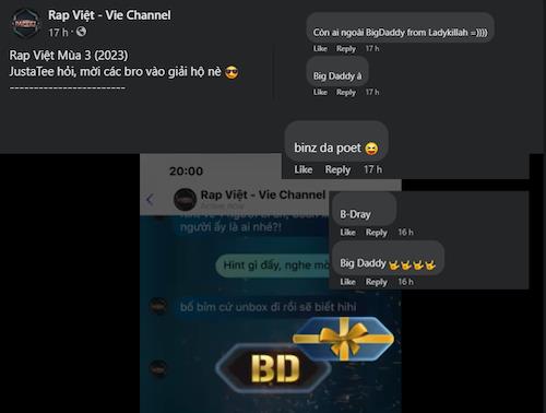 Trước đó, trên fanpage chính thức của Rap Việt còn tung ra 2 đoạn clip ngắn về đoạn chat với Karik và JustaTee, với nội dung “úp mở” về nhân vật bí ẩn nào đó có tên: R, BD. Sau khi clip box chat được đăng tải đã nhận về lượt tương tác lớn, cùng hàng loạt bình luận tò mò suy đoán từ khán giả. Có không ít cái tên được đưa ra về loạt nhân vật bí ẩn này như: Rhymastic, B Ray, Ricky Star, Rtee, BigDaddy, Rambo, Blacka, Binz Da Poet…, thậm chí có fan còn hài hước gọi luôn tên Ronaldo và chế luôn loạt rap name mới như B Day, Baby Red…