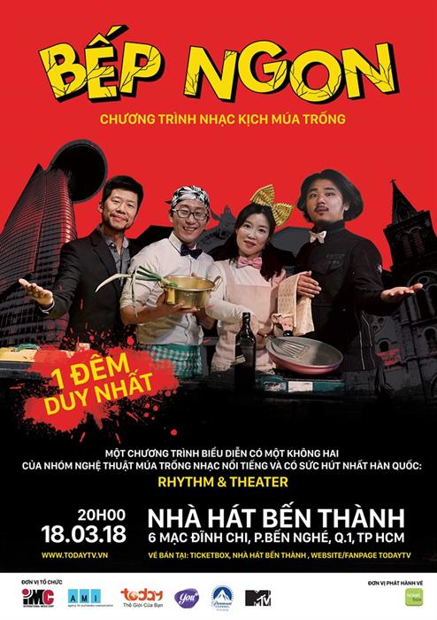 Tintuc - Nhóm nghệ thuật múa trống nhạc nổi tiếng và có sức hút nhất Hàn Quốc sẽ có đêm diễn duy nhất tại Tp.Hồ Chí Minh, trong chương trình nhạc kịch múa trống “Bếp Ngon” diễn ra vào lúc 20h00 ngày 18/3/2018 tại Nhà hát Bến Thành, Tp.Hồ Chí Minh.