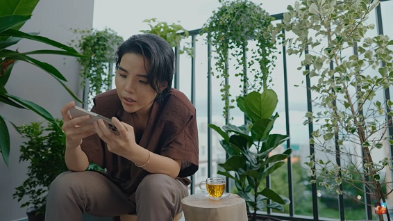 Chọn khung cảnh là ban công của ngôi nhà đầu tiên do chính tay mình mua được sau 10 năm miệt mài hoạt động nghệ thuật, Vũ Cát Tường tận hưởng cảm giác tự do trong một buổi chiều thảnh thơi, không bị những lịch trình show diễn “bủa vây” như mọi khi. Đó cũng là lúc mà tác giả Tìm Hành Tinh Khác nói về câu chuyện “Dừng lại để nhìn lại”.