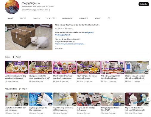 maly.gaugau: với chủ đề xoay quanh hai bé mèo May và July, tăng 38.910 subscribe