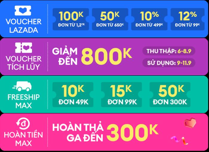 Ngoài những sản phẩm chính hãng với giá siêu hời, Lazada còn mang đến nhiều loại voucher giá trị trong siêu sale lần này. Với mỗi đơn hàng, người mua có thể tận hưởng mức giảm sâu khi thu thập 6 loại voucher sau:
