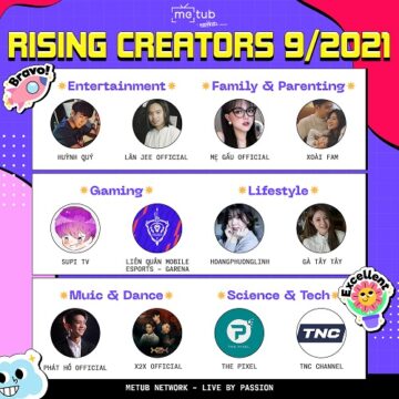 YouTube được xem là một trong những kênh có lượt truy cập cao nhất đối với các nền tảng mạng xã hội trong thời đại công nghệ 4.0. Vì thế mà việc tìm kiếm thông tin cũng như giải trí cũng được nâng cấp để phục vụ cho nhu cầu của mỗi chúng ta. Hiện nay, rất nhiều chủ đề hay và phong phú cũng được những nhà sáng tạo nội dung khai thác và biến hóa một cách triệt để để tạo ra sân chơi lành mạnh cho cộng đồng. Đồng thời đây cũng là phương thức thu hút và tăng lượt tương tác với khán giả đăng kí kênh của mình. Vừa qua, các nhà sáng tạo nội dung đã tận dụng những ý tưởng sáng giá để cho ra mắt nhiều video chất lượng. Trong đó, METUB Network chính thức công bố những YouTuber có thành tích tăng trưởng vượt bậc trong tháng 9 với các lĩnh vực nổi bật khác nhau như: Entertainment, Family and Parenting, Gaming, Lifestyle, Music and Dance, Science and Tech.