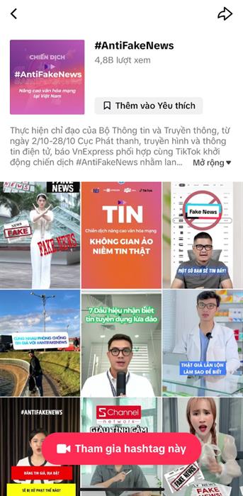 Vừa qua, Chiến dịch Tin với thông điệp "Không gian ảo, niềm tin thực" đã được thực hiện dựa trên mục tiêu nâng cao nhận thức của công chúng về tin giả, tin sai sự thật. Nằm trong khuôn khổ chiến dịch, cuộc thi "Anti Fake News" đã được phát động do Cục Phát thanh Truyền hình và Thông tin Điện tử (Bộ Thông tin Truyền thông) phối hợp với Báo VnExpress, FPT Online phát động và TikTok là đơn vị đồng tổ chức cuộc thi. Cuộc thi nhằm khuyến khích người dùng sáng tạo nội dung video trên TikTok giúp lan tỏa thông tin tích cực, hạn chế tin giả, tin sai sự thật trên không gian mạng. Đến nay, #AntiFakeNews đã nhận được sự hưởng ứng tích cực từ hơn 4,8 tỷ lượt xem và trở thành nền tảng giúp thúc đẩy không gian số phát triển an toàn và lành mạnh hơn thế nữa.