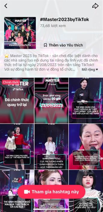 Ghi nhận hơn 73,6 tỷ lượt xem trên hashtag #Master2023byTikTok, cuộc thi Master 2023 by TikTok đã khép lại với những cột mốc ấn tượng, từ đó mở ra những sân chơi và nền tảng giao lưu - chia sẻ mới, đóng góp cho tiến trình đa dạng hoá nội dung và ngôn ngữ video ngắn.