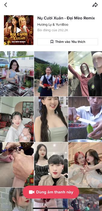 "Nụ Cười Xuân" là ca khúc xuân quen thuộc đã được Hương Ly phát hành nhân dịp Tết 2022. Bài hát là lời tỏ tình mùa xuân dễ thương, nhẹ nhàng và đầy trong sáng. Với bản remix mới của DJ Đại Mèo, bài hát đã nhanh chóng được lan truyền trên nền tảng vào đầu năm 2023 với xu hướng nhảy cực kỳ đáng yêu nhân dịp đầu xuân. Ca khúc đã mang đến mùa xuân đầy rực rỡ với sự hưởng ứng của được đông đảo người dùng, thu hút hơn 292 nghìn lượt xem cùng 225 nghìn video tham dự.