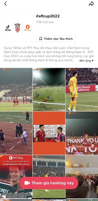 Với những người hâm mộ bóng đá Việt, giải vô địch Đông Nam Á - AFF Cup là một trong số những giải đấu đáng được mong chờ nhất trong năm. Trở lại dưới tên gọi AFF Mitsubishi Electric Cup 2022 cùng với sự đồng hành của TikTok, giải đấu năm nay tiếp tục lan tỏa tinh thần bóng đá mạnh mẽ hơn nữa trên khắp nền tảng. Xuyên suốt mùa giải, hashtag #AFFCup2022 đã ghi lại những khoảnh khắc đáng giá trên sân bóng và quá trình “tiếp lửa” cho đội tuyển Việt Nam trên chặng đường chinh phục ngôi vị vô địch. Tình yêu dành cho môn thể thao vua của những người hâm mộ đã mang về 528 nghìn video và 7,7 tỷ lượt xem trên TikTok.