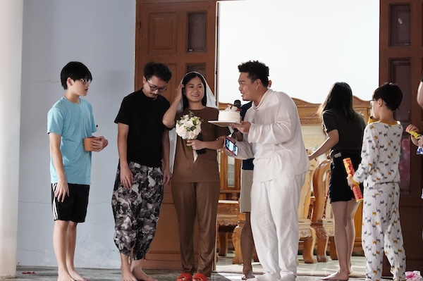 Trong bữa tiệc, câu chuyện về việc Lâm Vỹ Dạ cùng đi đám cưới đình đám của Midu với vợ chồng Huỳnh Đông – Ái Châu nhưng không hề biết khiến nhiều người bật cười. Lâm Vỹ Dạ cũng bật mí lý do Hứa Minh Đạt không đến buổi lễ này: “Anh Đạt nói ở đó chỉ có 1 Minh Đạt. Nếu ảnh tới nữa, người ta tưởng lầm là chồng cô dâu thì sao. Chú rể bên kia thổi sáo, bên đây chỉ có thổi nồng độ cồn thôi”.